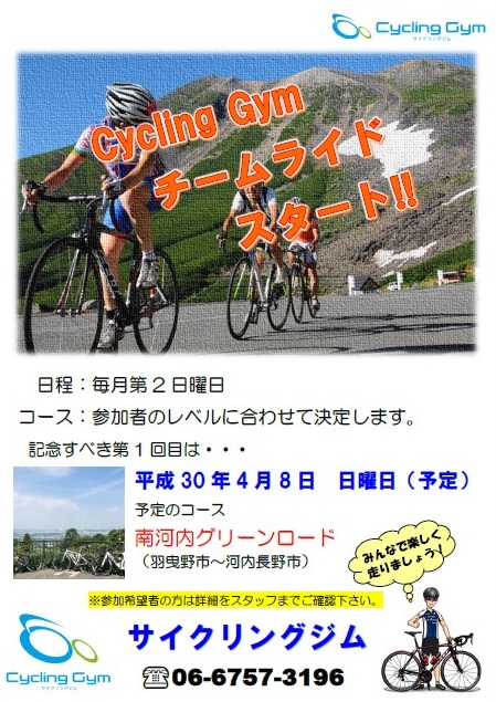 サイクリングジムでは、チームライドを来月4月8日(日)からスタートします。基本毎月第二日曜日です。初回のコースは南河内グリーンロードの予定ですが、参加者のレベルに合わせて変更しますので、初心者・女性も大歓迎です。JCA公認のサイクリングリーダーも参加しますのでご安心下さい。詳細はサイクリングジムのスタッフまでお問い合わせ下さいm(__)m